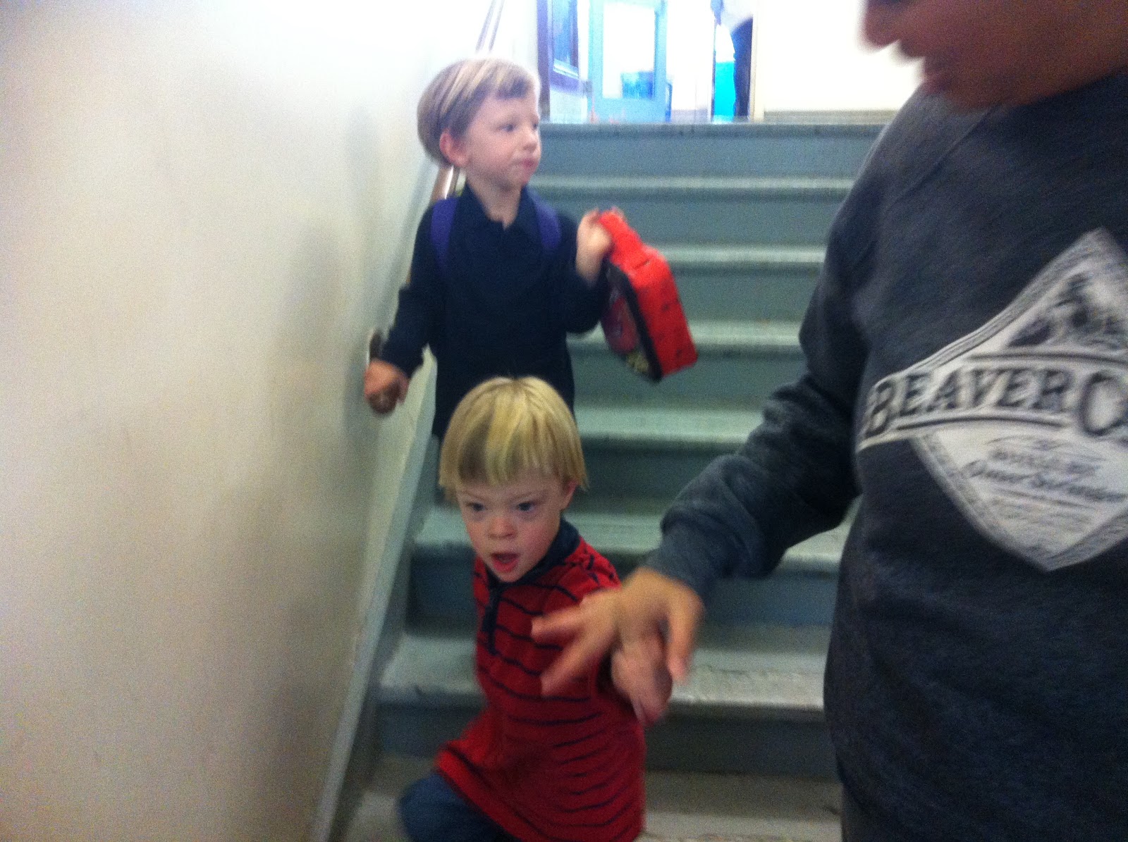A rainy morning necessitated some stall tactics, as arriving too early meant the boyos and I were forced to skip the playground and wander the crowded hallway outside the classroom until the bell rang...